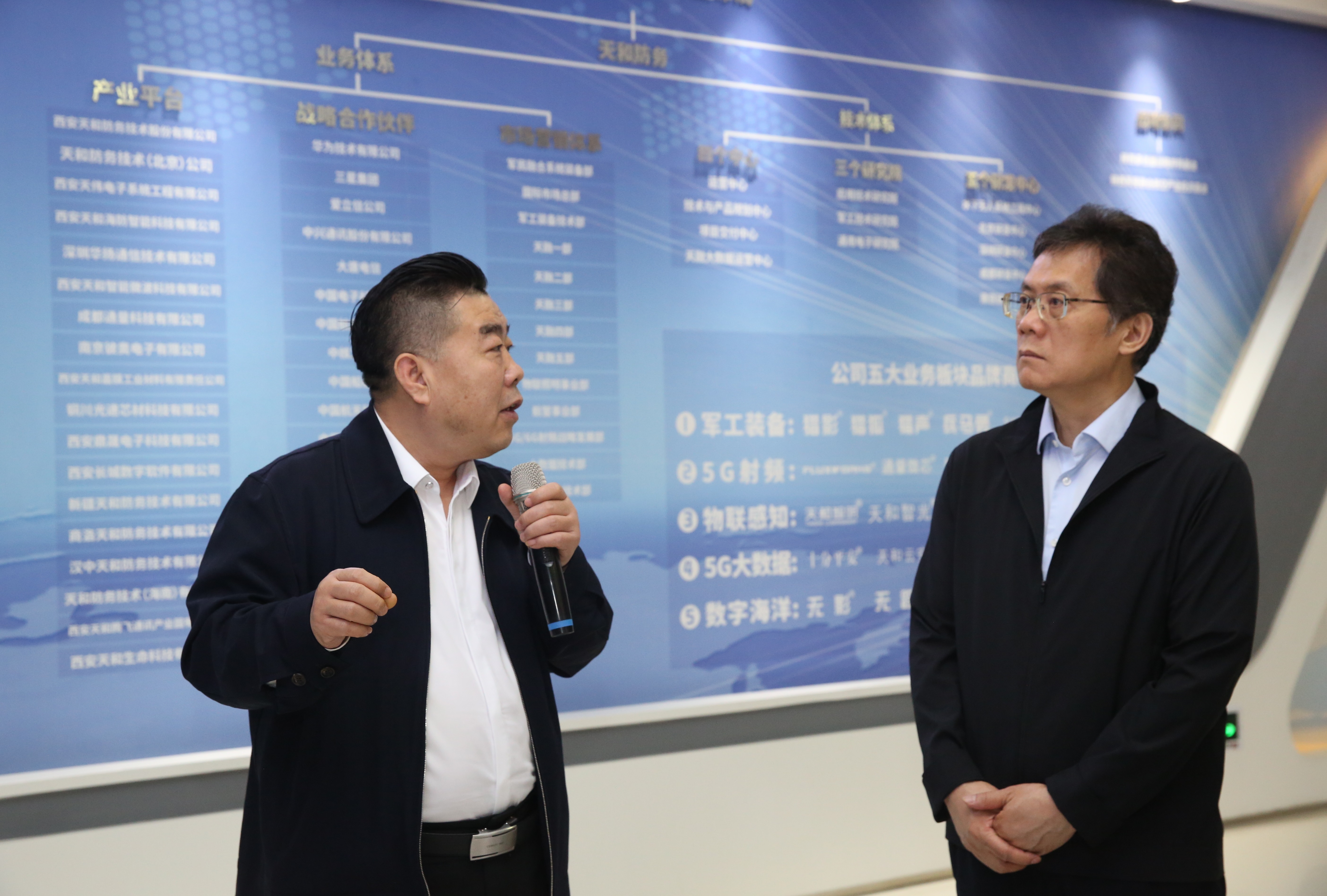 調(diào)研期間,董事長(zhǎng)賀增林詳細(xì)介紹了企業(yè)民參軍歷程和十四五重點(diǎn)產(chǎn)業(yè)布局情況,并就大數(shù)據(jù)、人工智能、無(wú)人系統(tǒng)、網(wǎng)絡(luò)安全和通信等新質(zhì)新域等產(chǎn)業(yè)發(fā)展取得的進(jìn)展做了匯報(bào),重點(diǎn)介紹了陜西秦創(chuàng)原重點(diǎn)建設(shè)項(xiàng)目——天和防務(wù)二期5G通訊產(chǎn)業(yè)園、天融大數(shù)據(jù)(西安)算力中心項(xiàng)目規(guī)劃建設(shè)情況。參觀展廳時(shí),賀增林介紹了天和防務(wù)核心軍民品、通訊器件、新材料、行業(yè)大數(shù)據(jù)、海洋探測(cè)等產(chǎn)品的研制及市場(chǎng)拓展情況。