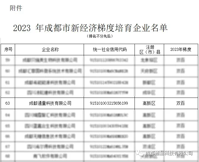 近日,成都市經(jīng)濟和信息化局發(fā)布了《2023年成都市新經(jīng)濟梯度培育企業(yè)名單》,成都通量科技有限公司獲評成都市“新經(jīng)濟雙百企業(yè)”稱號。